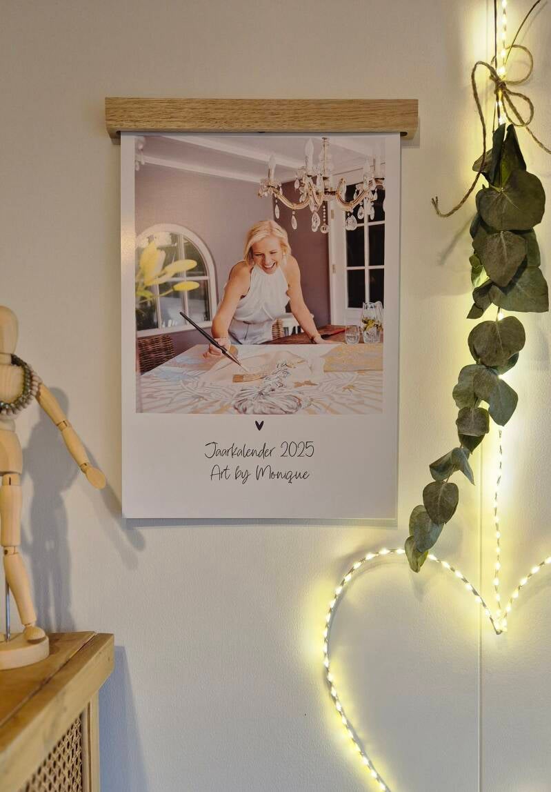 Luxe kalender in A3 formaat, inclusief houten ophang lijst.